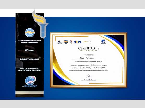Bellevue Clinic is proud to be the Winner of the International Patient Safety Award for Healthcare Digital Innovation & Adoption at the 13th International Health Dialouge, Hyderabad, January 2026, recognizing our commitment to Patient Safety and Innovation.